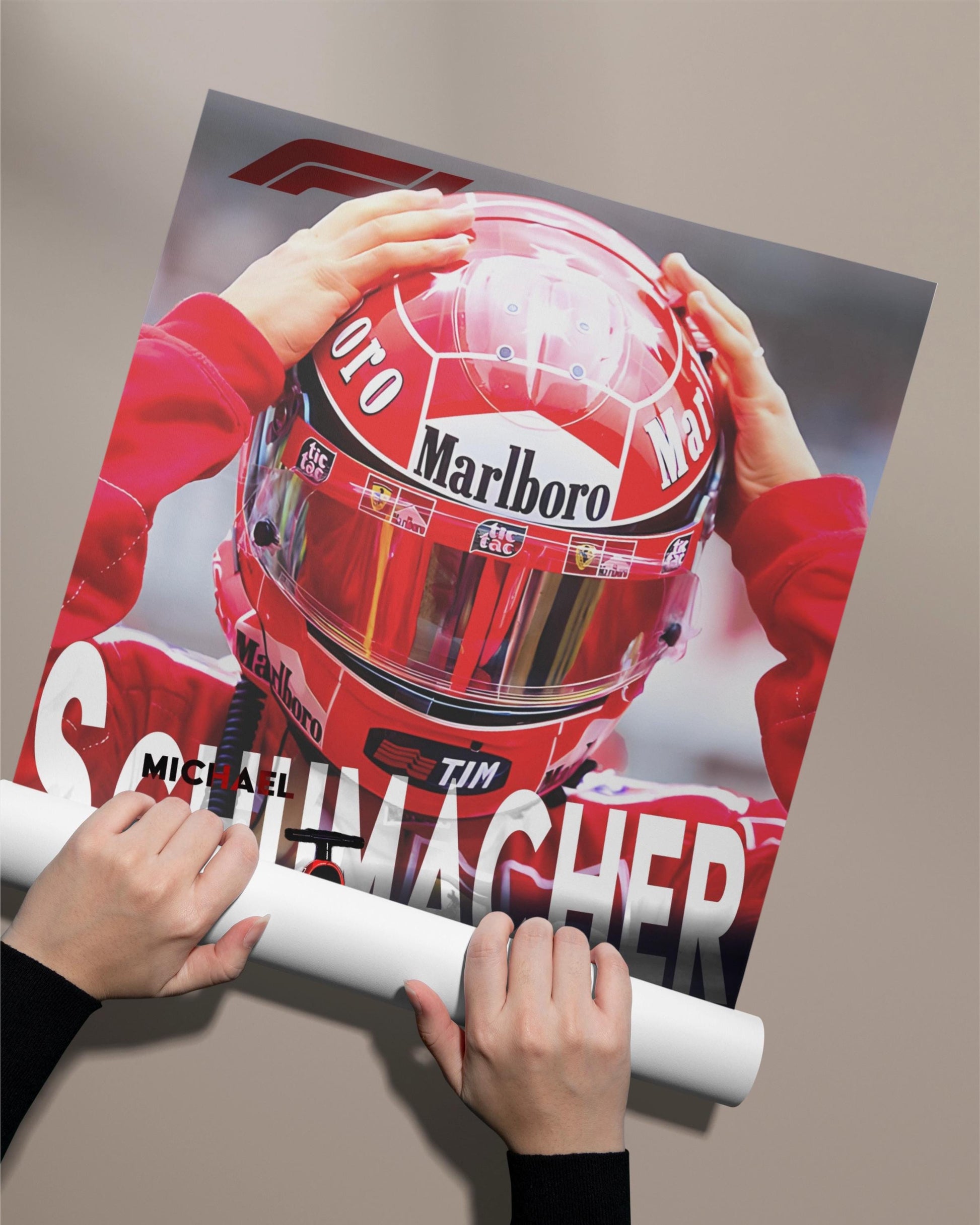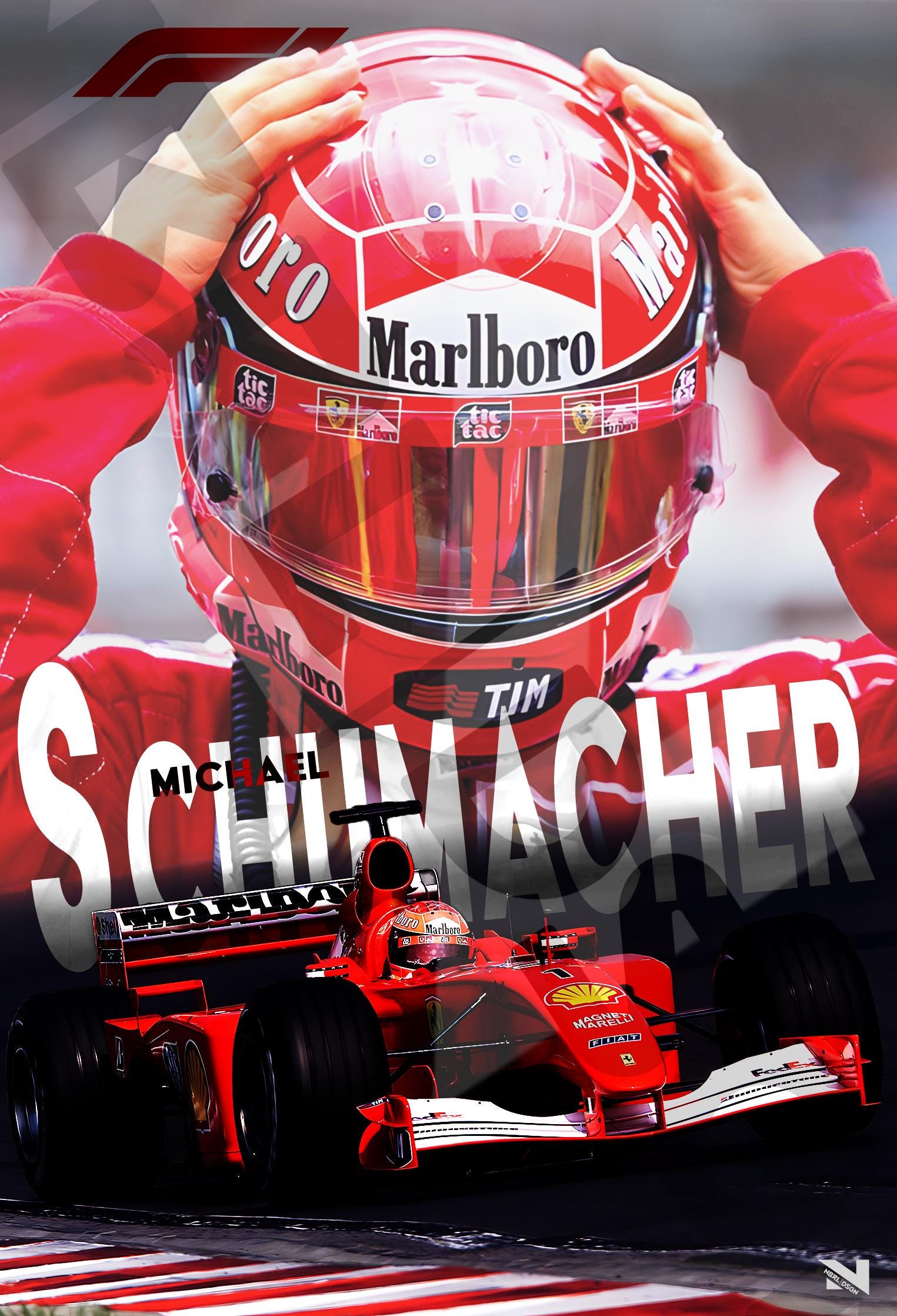 This design features a bold collage of Schumacher's intense focus behind the visor and the roaring Ferrari on track – a powerful tribute to the 7-time World Champion and his unforgettable era of dominance.